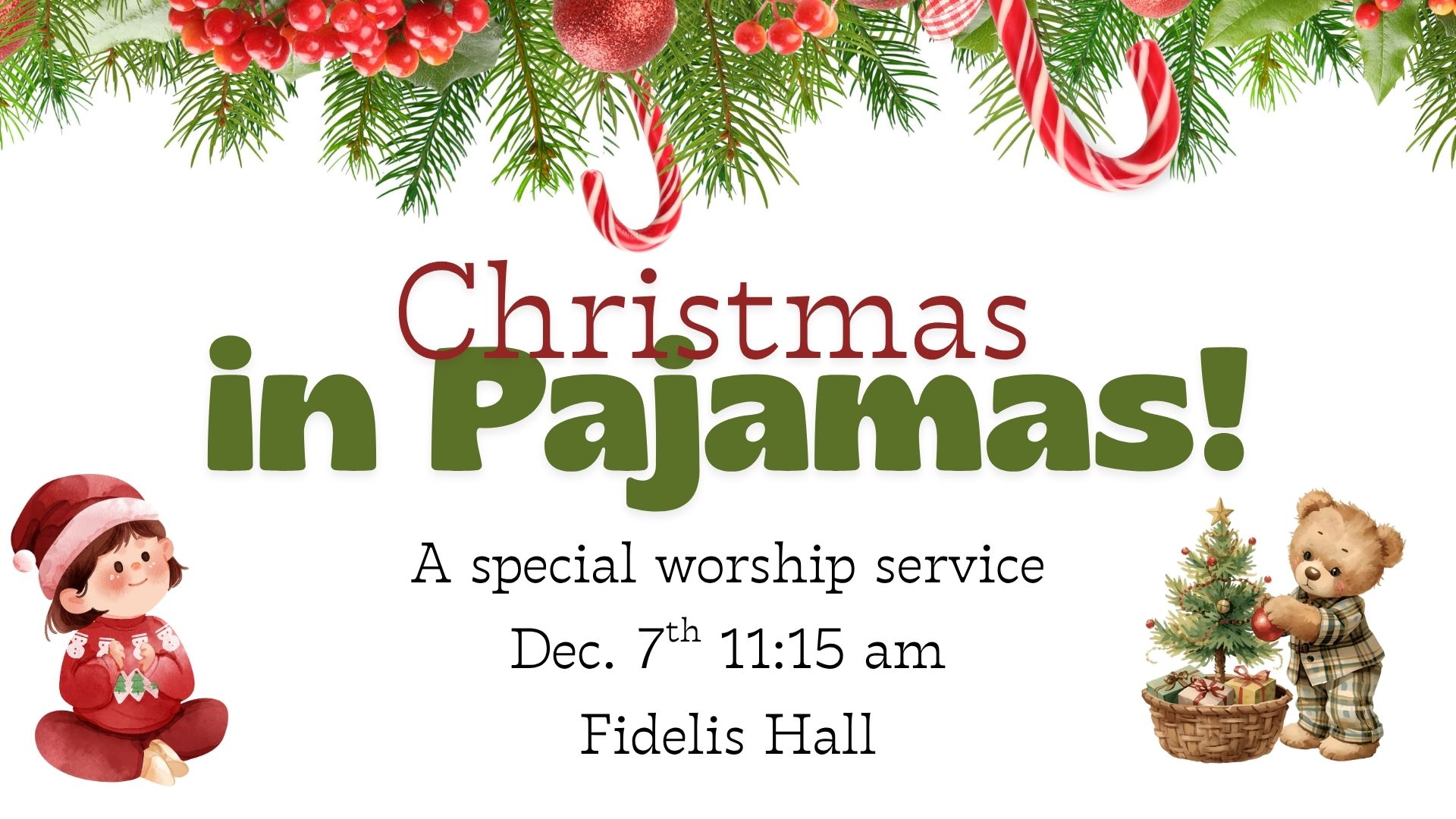 We invite you to a special kid-centered worship service on December 7th. Every year during our Modern Worship Service, we host a "Christmas in Pajamas" Sunday. Kids are encouraged to wear their Christmas jammies! We will have hot chocolate and Christmas treats for everyone. We'll have a special storytime and sermon designed just for our little ones. We hope you will join us for this adorable Christmas tradition!