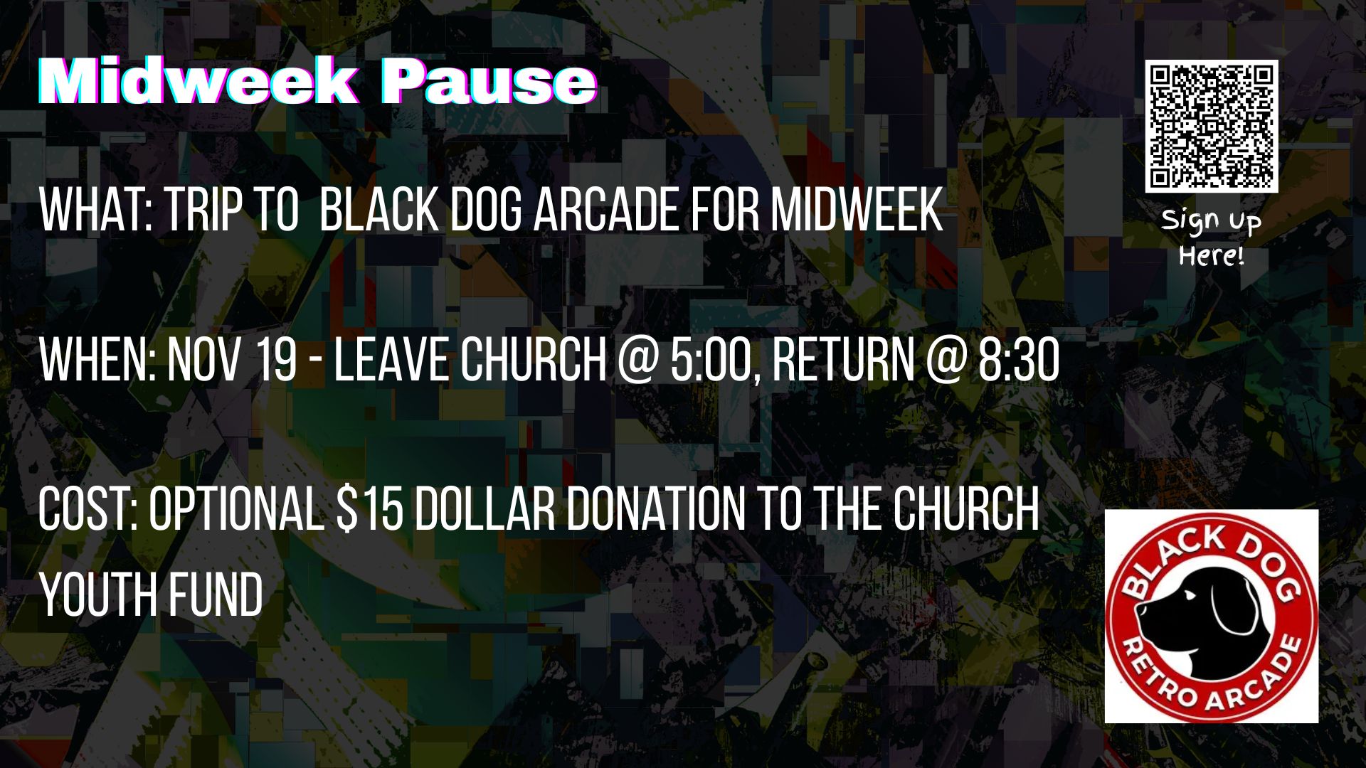 Our Youth group is doing something different this Wednesday! We are taking a trip to the Black Dog Arcade! Sign up below!
