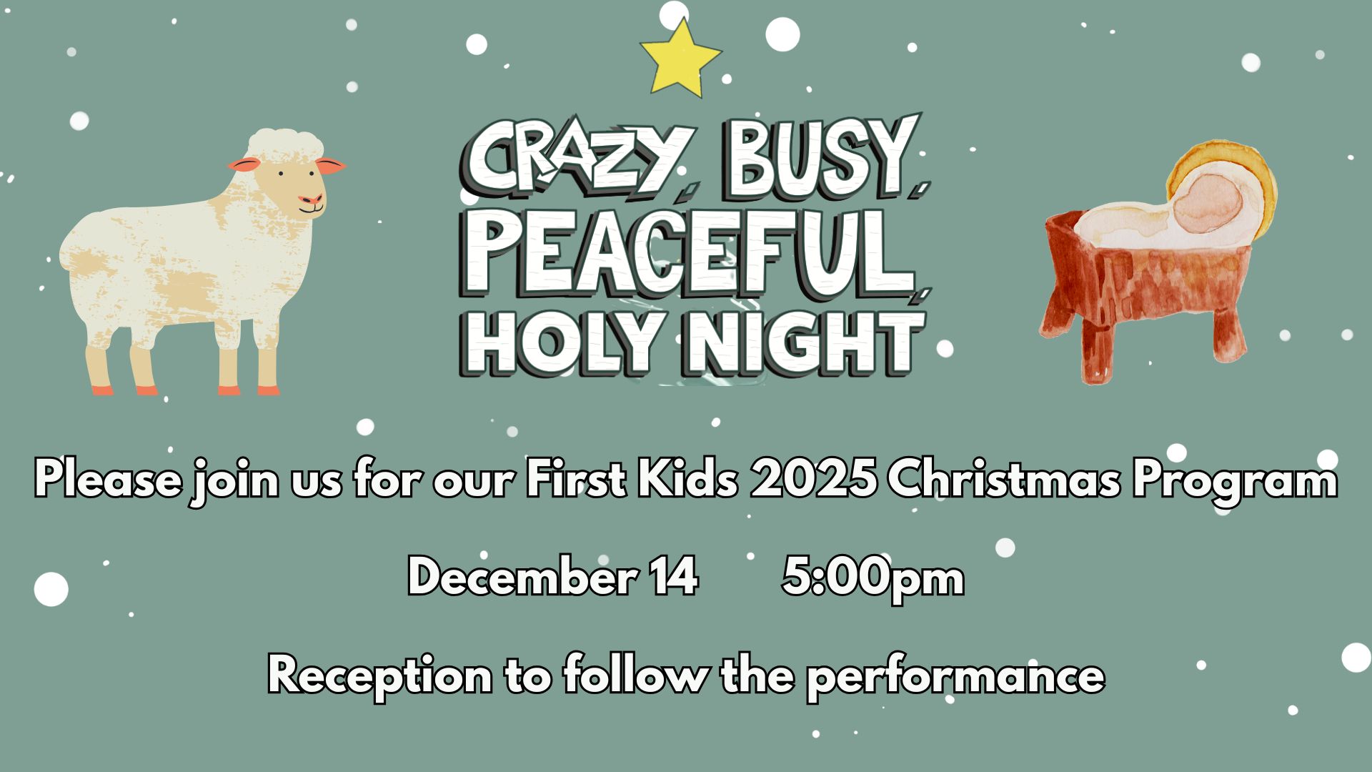 Christmas already?! YES! Our First Kids will start rehearsing for their annual Christmas program starting November 9th @ 5:00 pm. This year's play is called "Crazy, Busy, Peaceful, Holy Night," focusing on a family running in every direction and potentially missing the peace of Christ in the midst of Christmas craziness. Will they find the meaning of Christmas in time? Come see the final performance at 5:00 pm on December 14th.