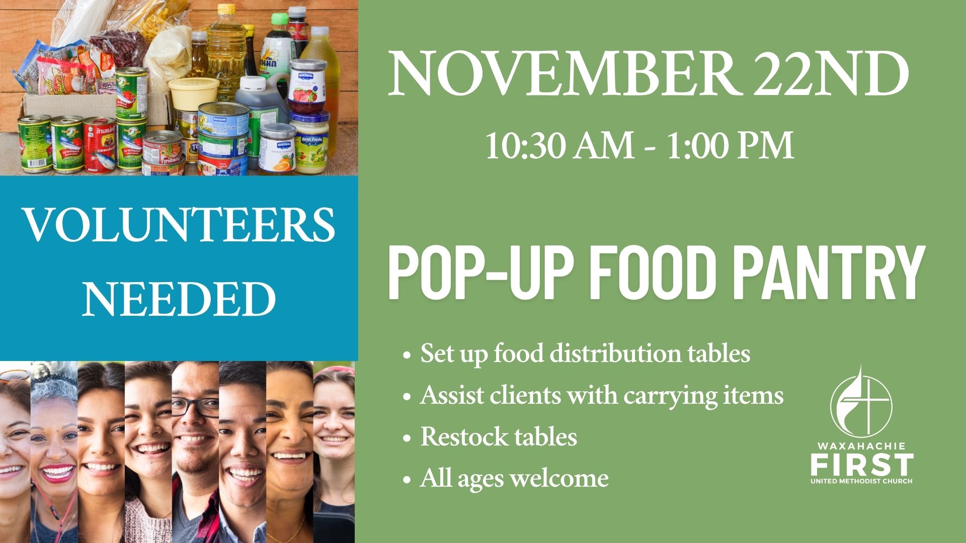 On the fourth Saturday of each month, FUMC partners with Manna House to provide a pop-up food pantry. Food is distributed on a first-come, first-served basis. For those interested in volunteering to help run the food pantry, volunteer registration is coming soon!