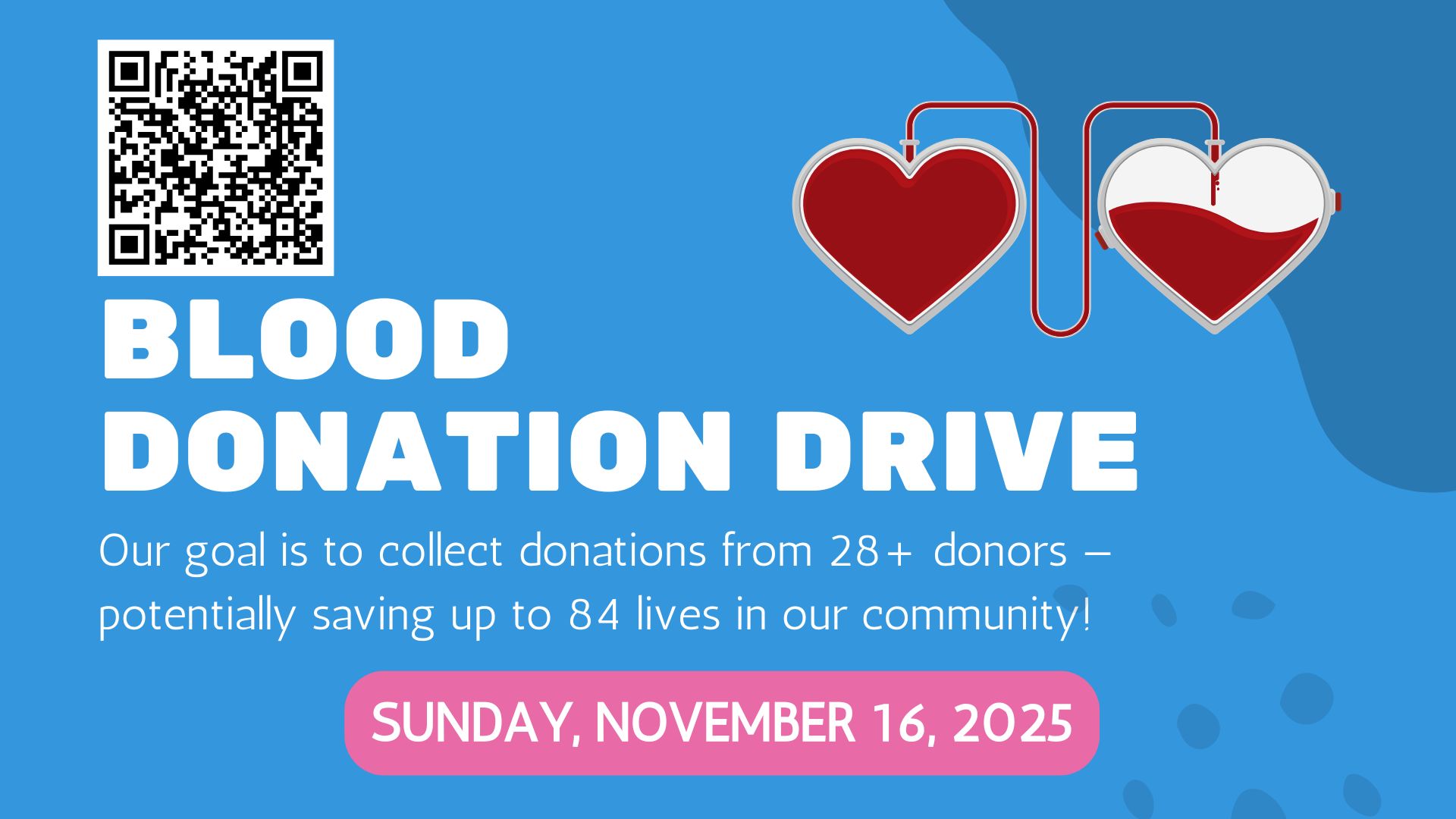 Come donate at our last blood drive of 2025! The Carter Blood Care bus will be parked in front of the church on November 16th from 10:00 am - 2:00 pm. Pre-registration is required! Sign up at the link below.