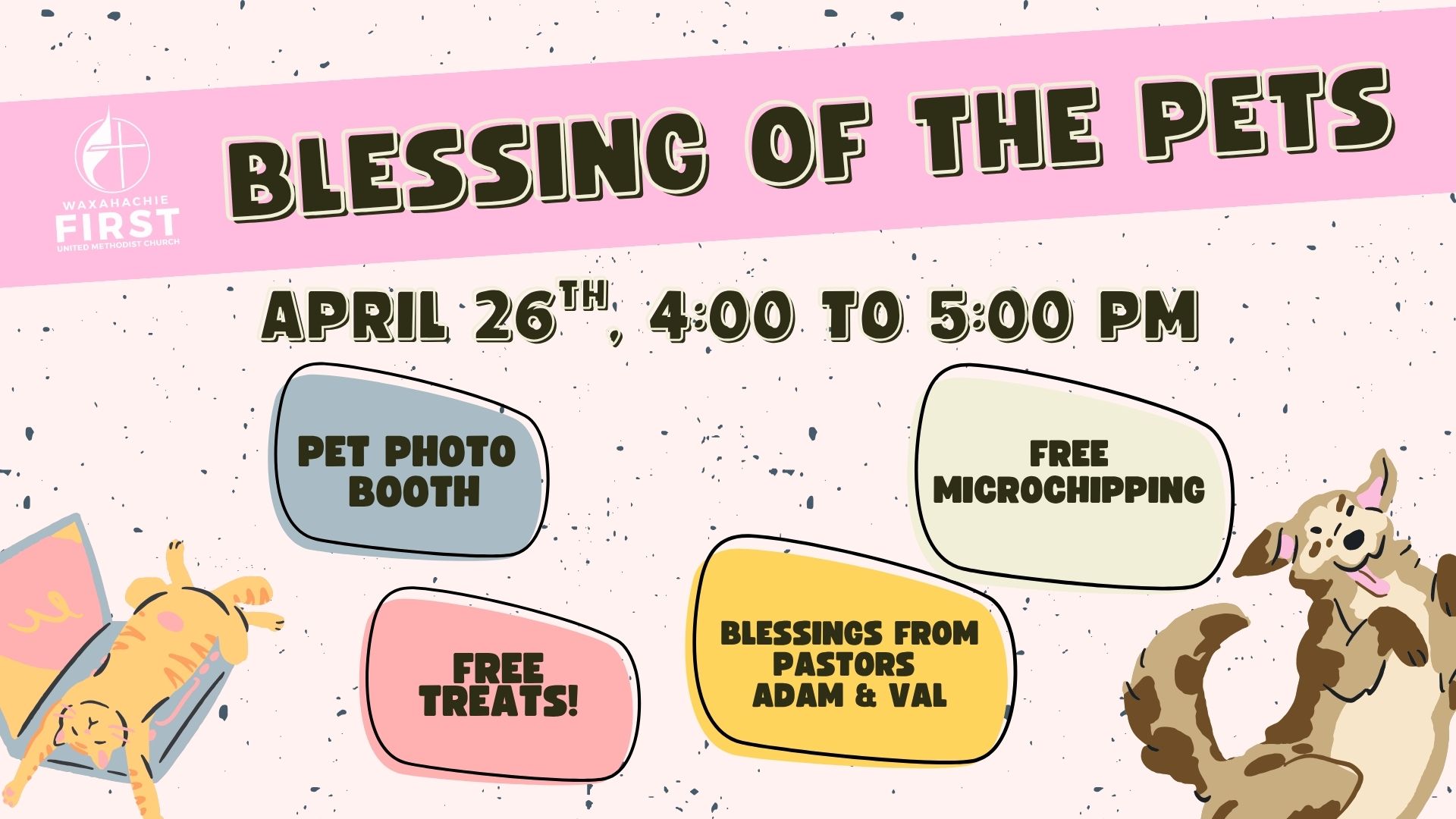We are SO excited to announce our first Blessing of the Pets Event. Join us on April 26th from 4 to 5 pm. Pastors Adam and Val will be available to bless your pets - of any kind! Free micro-chipping for your pets will be available thanks to our partners at the Pet Coalition of Ellis County and Dr. Watson at City Vet Waxahachie. Ellis County Pet Resort will be there with a photo booth set up for you and your pets to remember their blessing!