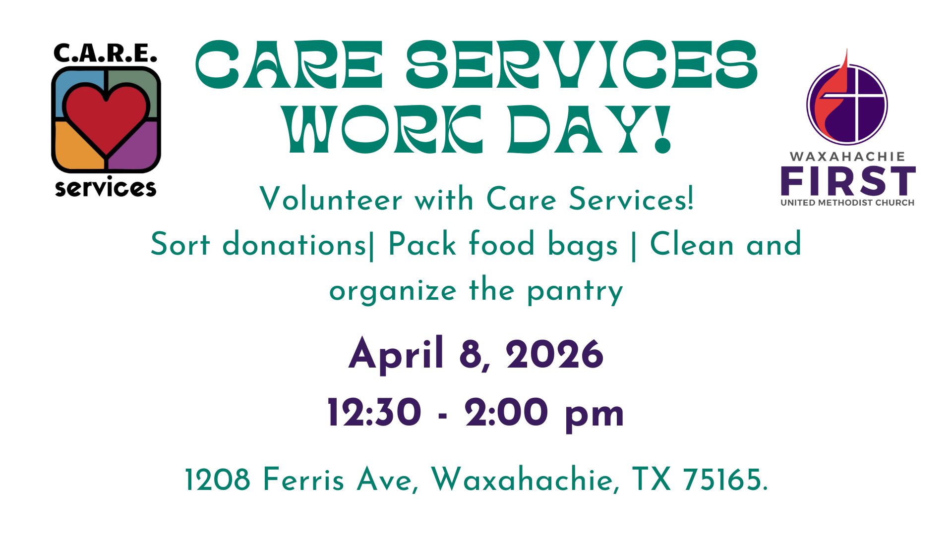 Our monthly workday at Care Services (formerly Waxahachie Care) is April 8, 2026 from 12:30 to 2:00 pm. Volunteers meet to sort donations at the food pantry at 1208 Ferris Ave, Waxahachie, TX 75165.