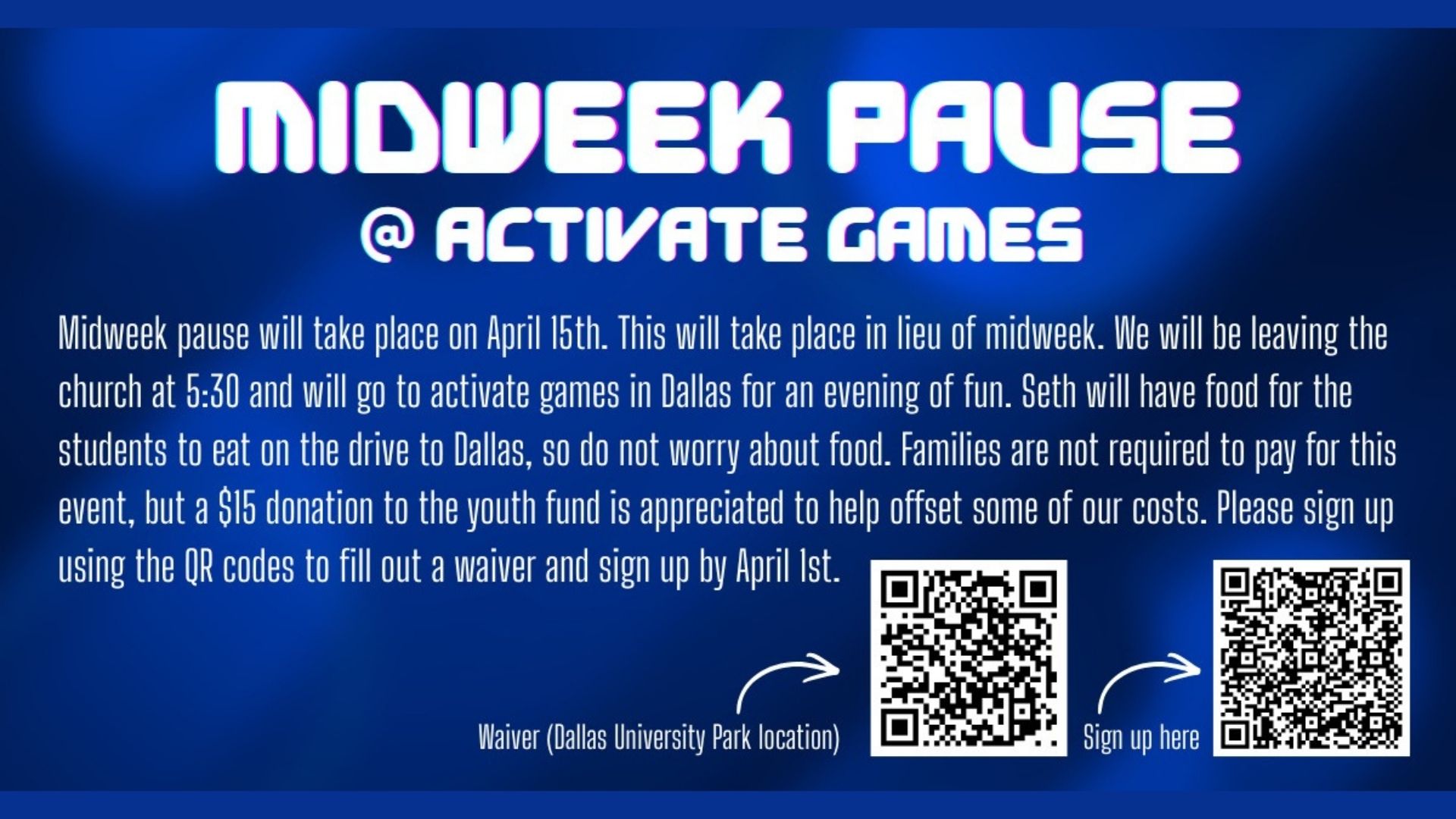 On April 15th, instead of our regular Youth midweek, the Youth group will be headed to Activate Games! The evening is free of charge, and dinner is provided. If you would like to make a $15 donation to the Youth Fund, you may. Sign up by April 1st!