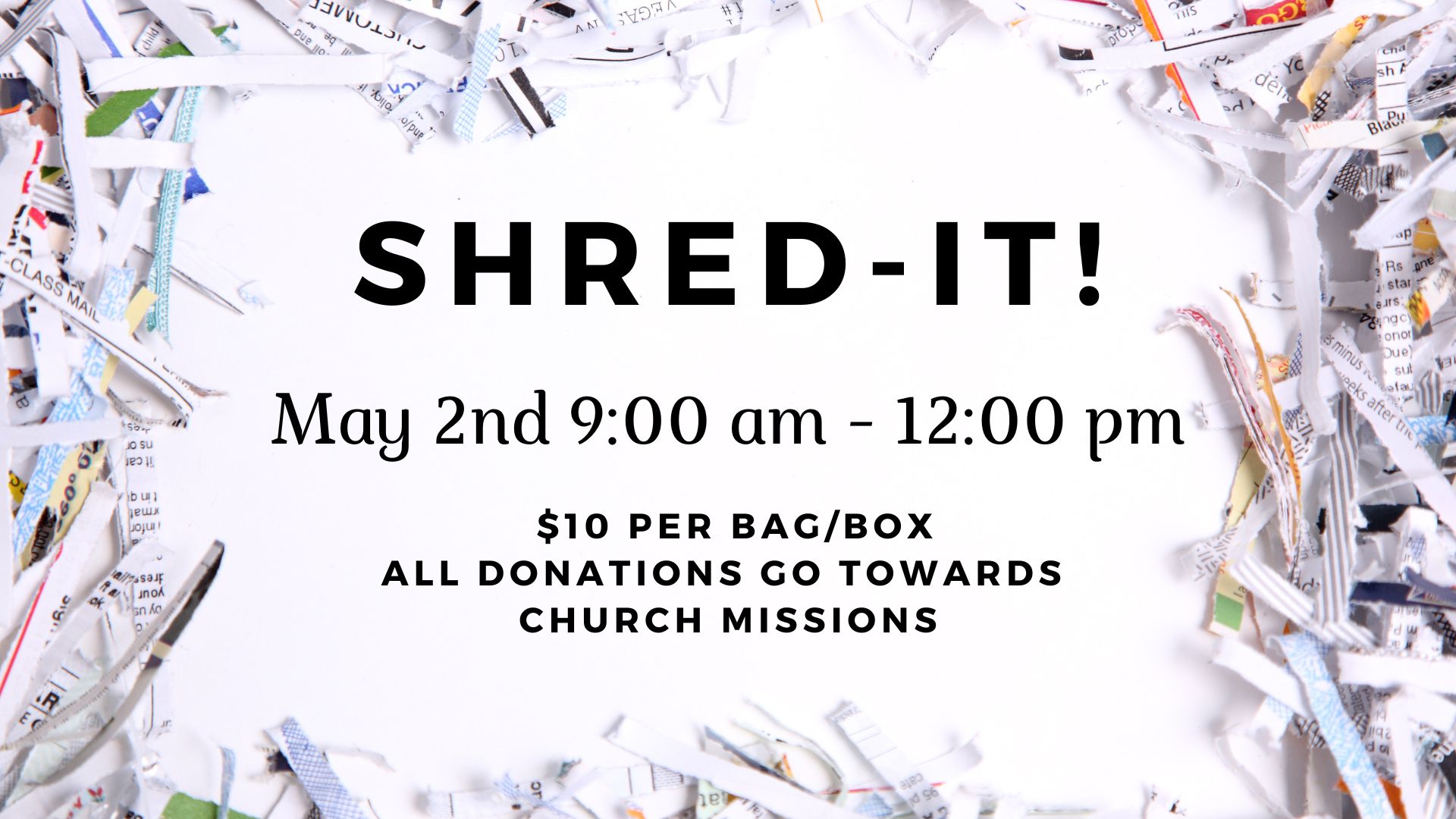 The Asbury Sunday School Class is hosting its annual Shred-it! event on May 2nd. Come by the front of the church and drop off any bags or boxes of paper to shred. This is a drive-through event! You don't even have to get out of your car. All funds go to support church missions.