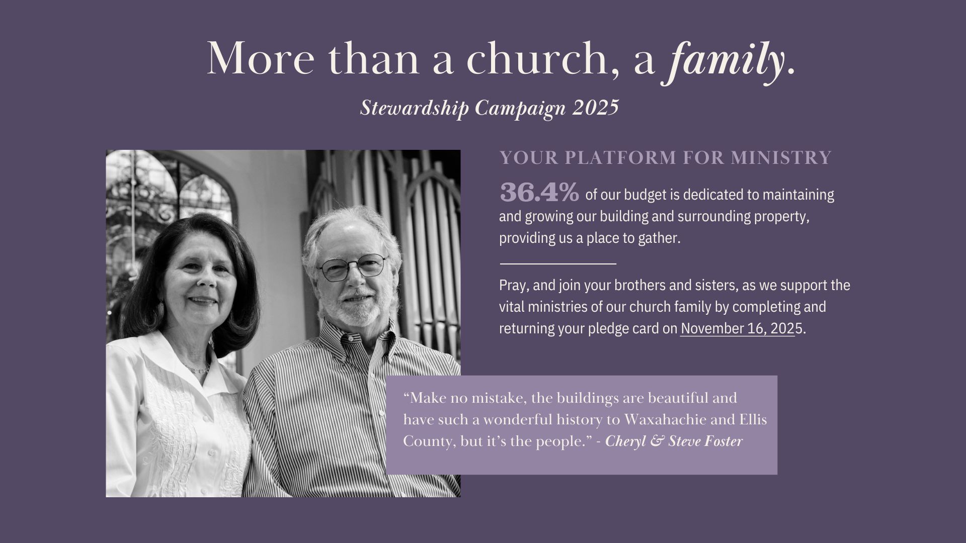The church stewardship campaign supports everything FUMC Waxahachie does, including worship, missions, Sunday morning classes, programs and services, and the staff and facilities